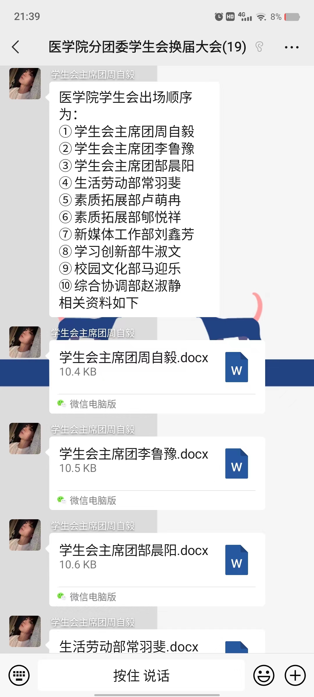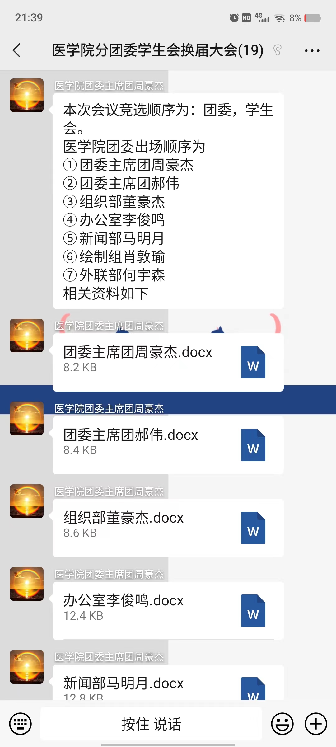 为了更高效开展工作,更好的为同学们服务,医学院团委和学生会于10月18日在线上举办医学院团委和学生会换届大会。本次大会参加人员有医学院团委书记李源杰、郑珂馨以及参加竞选的主席团和各部长干部。