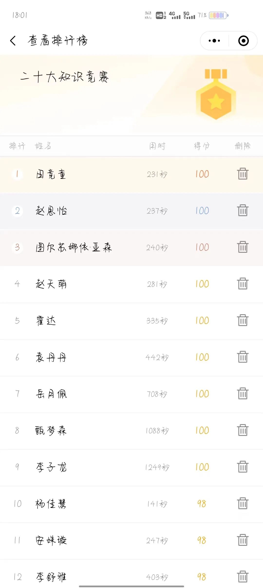 根据正确率和答题时长,最终选出一等奖田竞童等10名,二等奖安姝璇等20名,三等奖周甜甜等20 名;根据各班参与情况选出优秀组织奖5个。