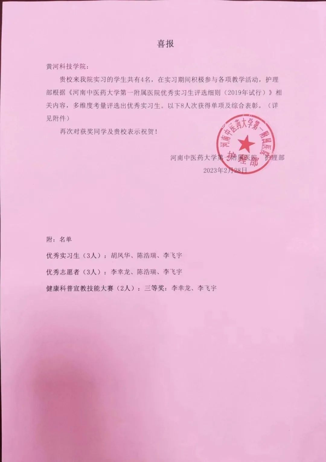 近日,河南省中医药大学第一附属医院召开2022-2023年度护理教学实习表彰大会,bat365官方网站四名护理专业名列其中,实习单位(护理部)向学校发来喜报,bat365官方网站四名学生在本院实习期间积极参与各项教学竞赛活动,经过多维度考核四名实习生全部获表彰,多人次获得“优秀实习生、优秀志愿者、健康科普宣教技能大赛三等奖”等荣誉,充分展示了bat365官方网站学生在实习岗位上的优秀风采。