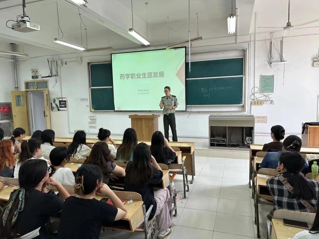 首先,李乐代表药学系全体师生欢迎大家的到来,表扬了新生良好的精神面貌,并介绍了药学专业就业特点,详细介绍了药学专业药品销售、药品研发、药品生产、药品注册流通等四大主要就业方向,并从如何就业、如何做好就业准备、沟通技巧三方面,对当前学生就业面临的普遍性问题给予了解答。他强调,医药销售职位仍占招聘岗位的半壁江山,鼓励学生树立正确的就业观念,先解决就业问题再优化职业方向。随后,对于能潜心钻研的同学,李乐建议其认真准备考研,以促进高质量就业。从学生需求出发,李乐就如何选择细分专业学校及学院等志愿填报问题、专业知识复习技巧、时间安排等方面,给同学们提供了很多宝贵的建议。最后,李乐展示了近年来考研优秀学长学姐事迹,并激励新生以优秀毕业生为榜样,做好大学规划,增强专业能力素养,全面提高自身素质,赢得未来的成功。