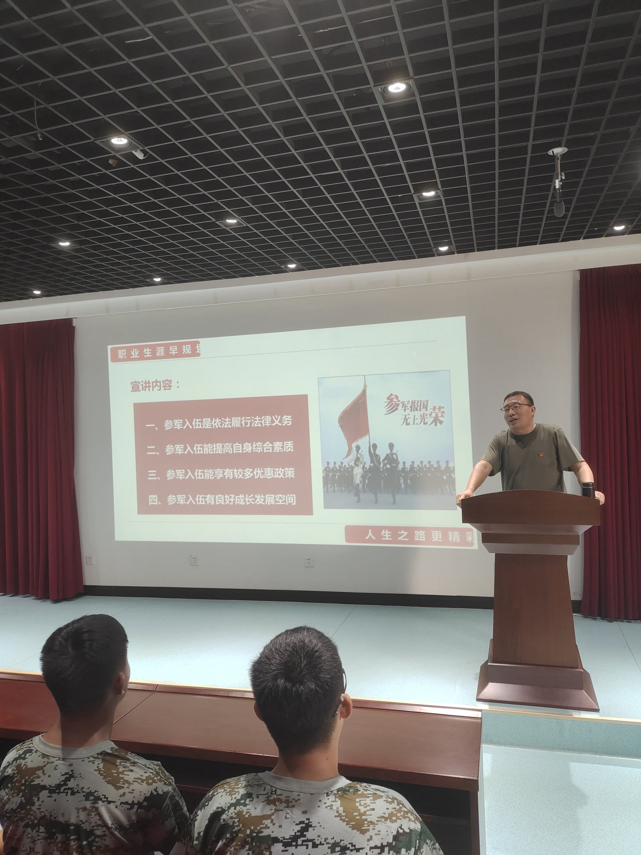 今天听了韩树栋老师对大学生入伍政策的宣讲解读,我了解到了关于征兵的相关政策法规,也对参军时间安排、入伍条件、服役待遇、退伍补偿等内容有了更多的了解,并且韩老师鼓励大学生要敢于有梦、敢于追梦、敢于圆梦,让青春在军营的历练中、在为祖国的奉献中闪光,我也希望经历了在医学院大学四年历练我也可以在实现中国梦的道路上完成自己的理想。