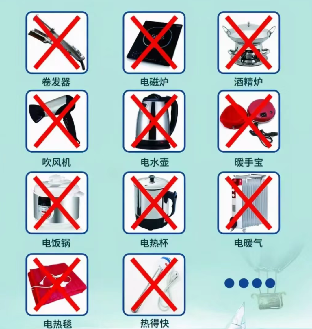 学生在宿舍中应自觉遵守宿舍管理规定,不私拉、乱拉、乱接电线;不使用电炉、电热杯、热得快、电饭煲、电热毯等违规电热器具;使用台灯、充电器、电脑等电器要注意与易燃物之间保持安全防火间距;室内无人时,应拔下插头关闭电源;不躺在床上吸烟或乱扔烟头,不在宿舍内存放固体酒精等易燃易爆物品,不得在宿舍使用固体酒精炉、瓦丝炉等明火设备,禁止在校园内任何区域焚烧物。