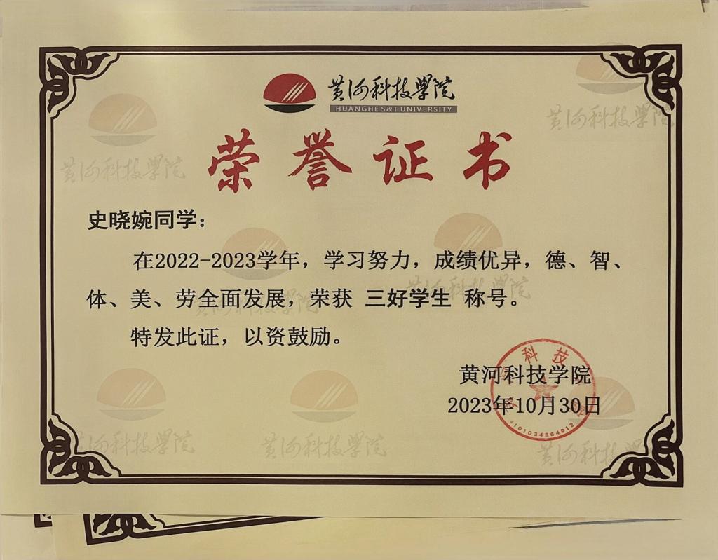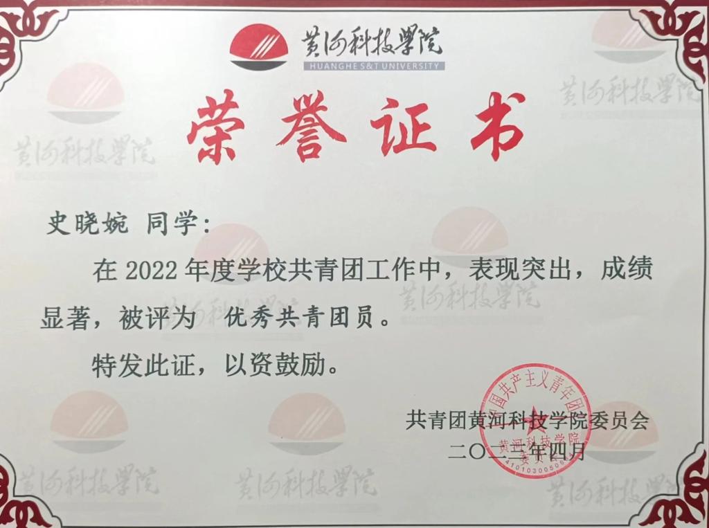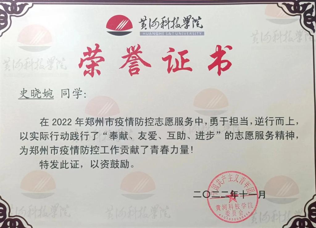 学习上,她认真努力,对于老师布置的作业,她都能保质保量完成,尽自己所能做到最好。作为班长,她积极组织并参加班级里的团日活动及爱国教育主题班会,营造良好的班级精神风貌,树立爱国情怀;作为楼管会成员,她参与并组织宿舍卫生检查活动,为建设美好宿舍环境起了带头作用。身为医学生,她甘为人先,全心全意为人民服务,热爱并积极参与社会实践。在疫情期间,她主动请缨参与郑州市疫情防控志愿活动,为社区群众采集核酸,筛查病例,在郑州市群众中树立良好的黄科院学子形象。