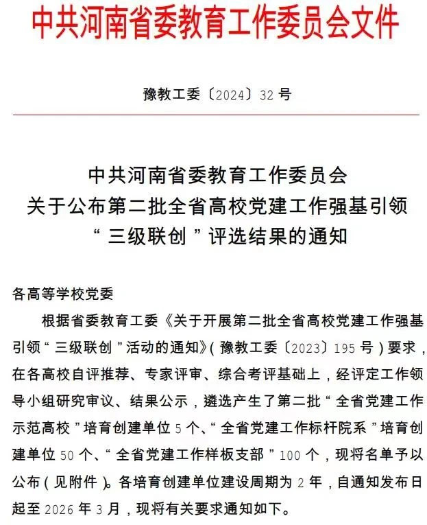 近日,中共河南省委教育工委公布了第二批全省高校党建工作强基引领“三级联创”评选结果。在学校自评推荐的基础上,经省委教育工委专家评审和综合考评,医学系学生第一党支部(现临床医学科教中心学生第一党支部)成功入选第二批“全省党建工作样板支部”培育创建单位。