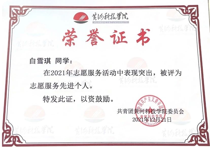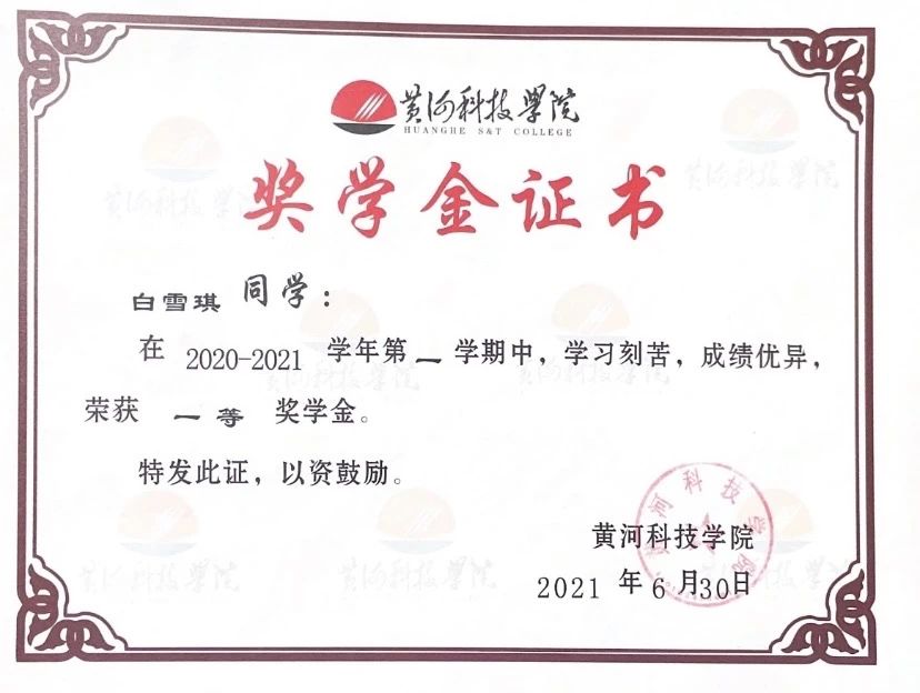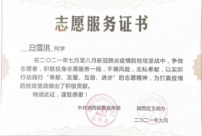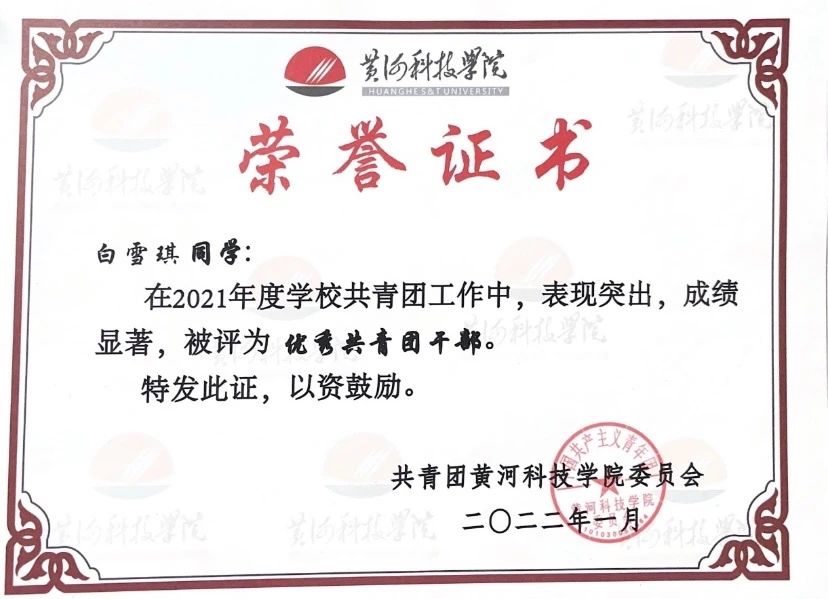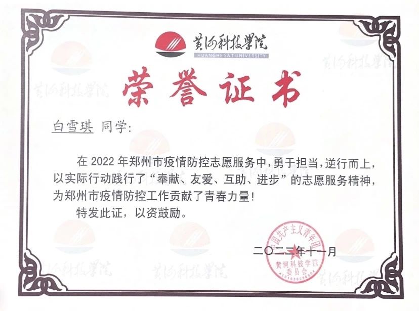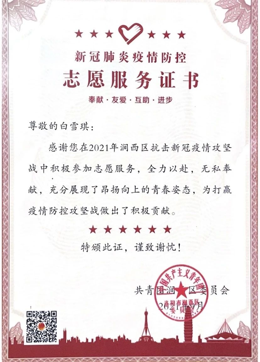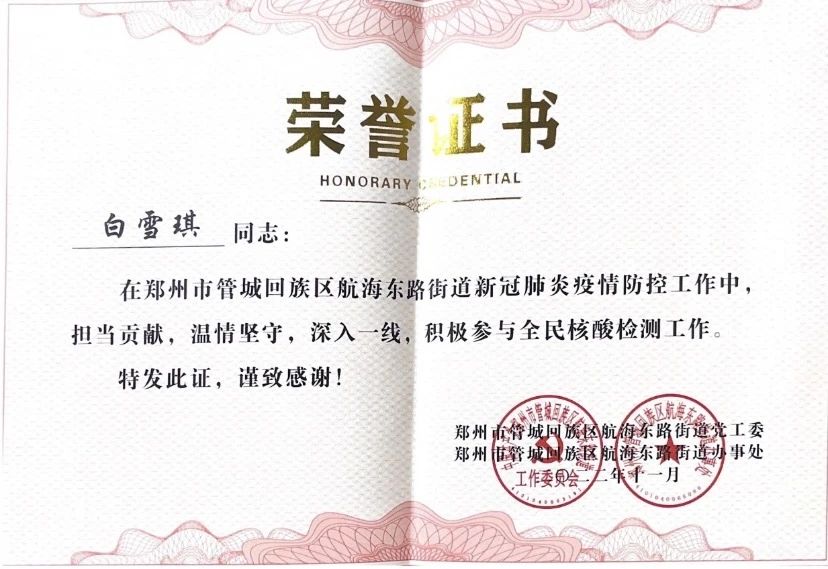 白雪琪,中共党员,2020级医学检验技术班团支书。考研初试成绩420分,复试89分,复试排名第一。在医院检验科实习期间,认真学习了细菌的分离培养和接种培养,熟悉无菌操作要领;大学入学就担任本科班级团支书,加入医学技术科教中心学生会,并于大二开始担任医学技术科教中心学生会团副职务,并获得“河南省优秀学生干部”;大三上学期报名参与郑州市疫情防控,为市民采集核酸,获得管城回族区新冠肺炎疫情防控领导小组办公室颁发的“志愿者防疫证书”。