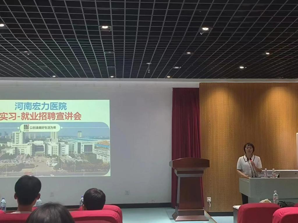 5月7日,bat365官方网站邀请河南宏力医院举行实习就业招聘宣讲会,护理科教中心实习生25人及2024届毕业生30人参加,河南宏力医院人力资源部主任许帅、科教部张学瑞主讲。