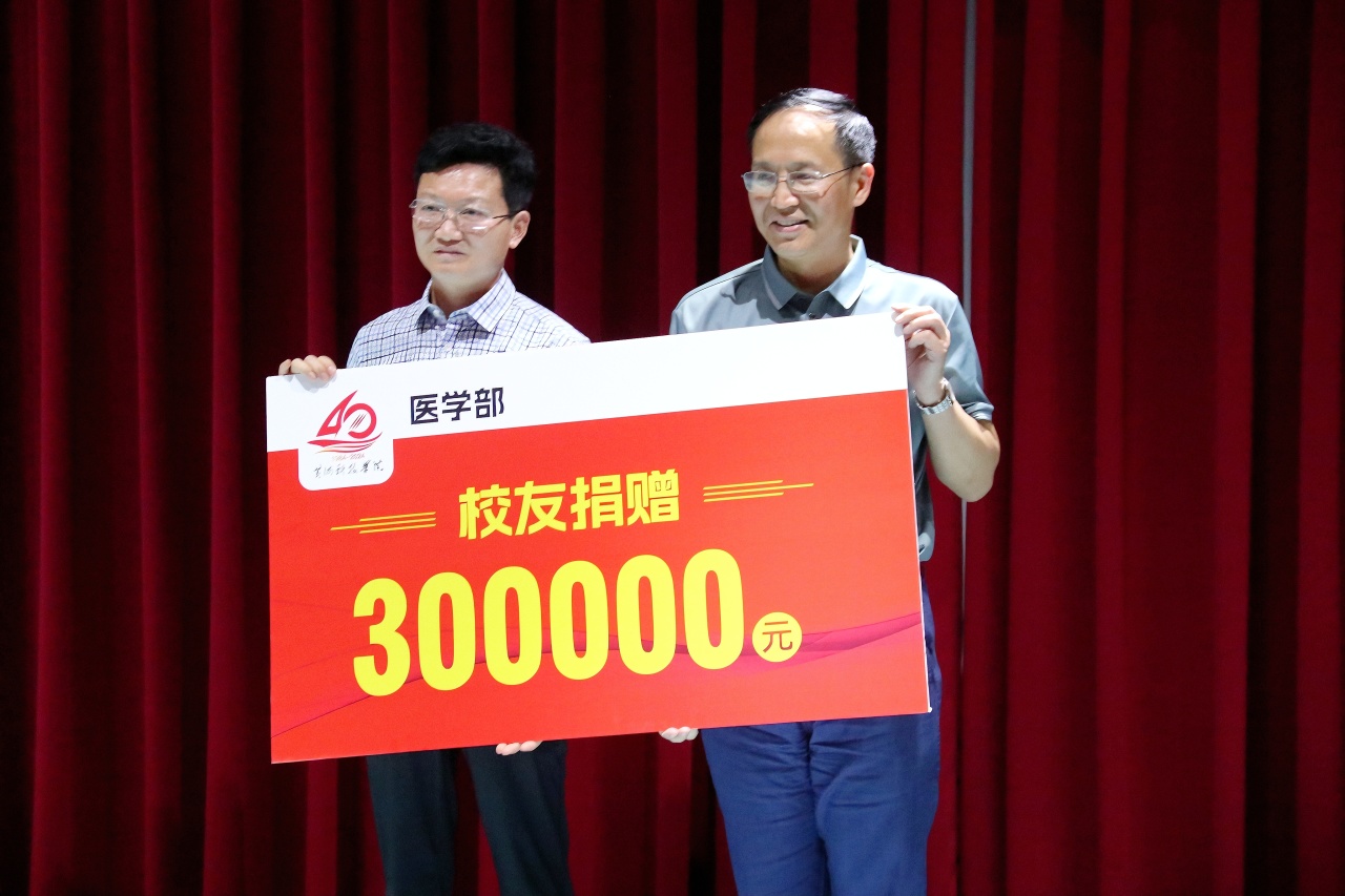 校友代表共捐赠款物165万余元,其中1999级中西医结合专业校友祁西涛与邵春霞夫妇捐赠款物125万元,1993级中西医临床专业校友范金平捐赠款物30万元,1988级五官专业校友常亮捐赠款物1万元,1999级中西医班级代表捐赠款物8.8万元,还有一些校友通过不同途径对学校进行了捐赠,广州校友会会长、91级校友陈春生校友捐赠12000元。冯长安、罗煜、李喜强、张光辉代表学校接受捐赠。