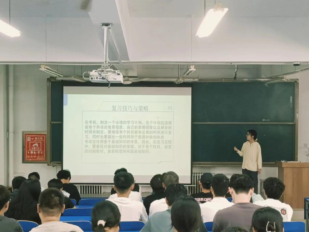 会上,康玉强强调了期末考试是对一个学期学习情况的检验和总结,青年突击队干部及队员要做到以下几点,一要牢记学生的身份,在学习上争先进,认真复习备考;二要明确目标,把握方法,科学高效备考,让优秀成为习惯;三要将组织监督、朋辈互助监督和严格自律相结合,营造积极向上的氛围,相互促进发展;四要做到诚实守信考试,自觉遵守校规校纪。随后,优秀学生代表22级张豪智和23级樊潇彤进行发言,他们向同学们分享了复习经验与方法,同时指出考试心态的重要性。最后,学习组宋柔睿从复习技巧与策略、考前纪律与注意事项三个方面对同学们进行了考前教育。