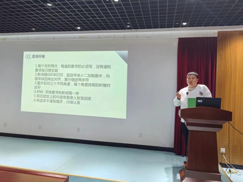 会上,申鹏洋围绕“团课开展”和“团本书写”两方面展开工作培训,以范本向各班团干介绍了团日活动记录的书写规范,强调了各项规章制度。接着,史添倩针对团支部工作特点,从“材料明细”和“材料提交”两方面讲解工作内容和要求,逐一为各团支书答疑解惑。最后,郑珂馨对全体班级的团支书提出四点建议,一是要铭记自身使命和责任,认真工作,服务同学;二是要加强学习,提升能力,注重团队协作能力的培养,学会与人沟通、协调,形成工作合力;三是要积极开展创新工作,以线上、线下两种方式,不断改善工作模式;四是要以身作则,严于律己,树立良好的榜样形象。