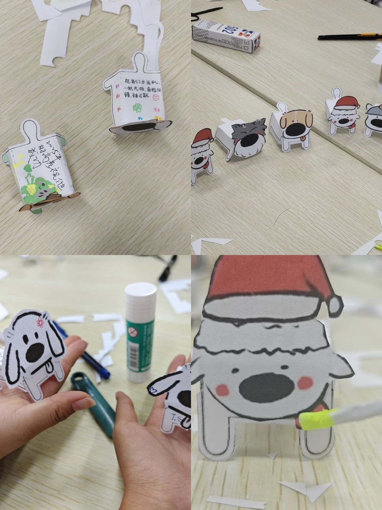 本次活动巧妙地将领养小狗的概念融入其中,鼓励同学们亲手DIY属于自己的独特纸小狗。参与者在事先准备好的卡片上,满怀深情地写下自己的内心独白、美好愿望或温馨祝福,随后“领养”一只亲手制作的纸小狗作为心灵的伴侣。这些纸小狗不仅是可爱有趣的手工艺品,更是同学们内心世界的情感寄托。