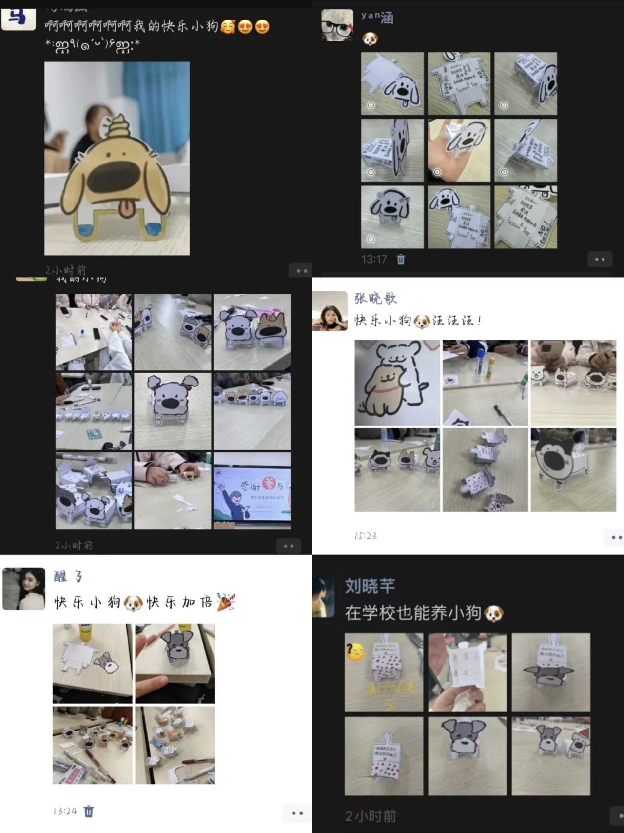 通过领养和与纸小狗的互动,参与者深刻感受到了来自内心的温暖与关怀,这不仅增强了他们的自我认知,还提升了情感的表达能力,进一步促进了心理健康水平的提升。活动结束后,同学们反响热烈,纷纷在社交媒体上晒出自己的纸小狗,分享活动中的温馨与快乐。
