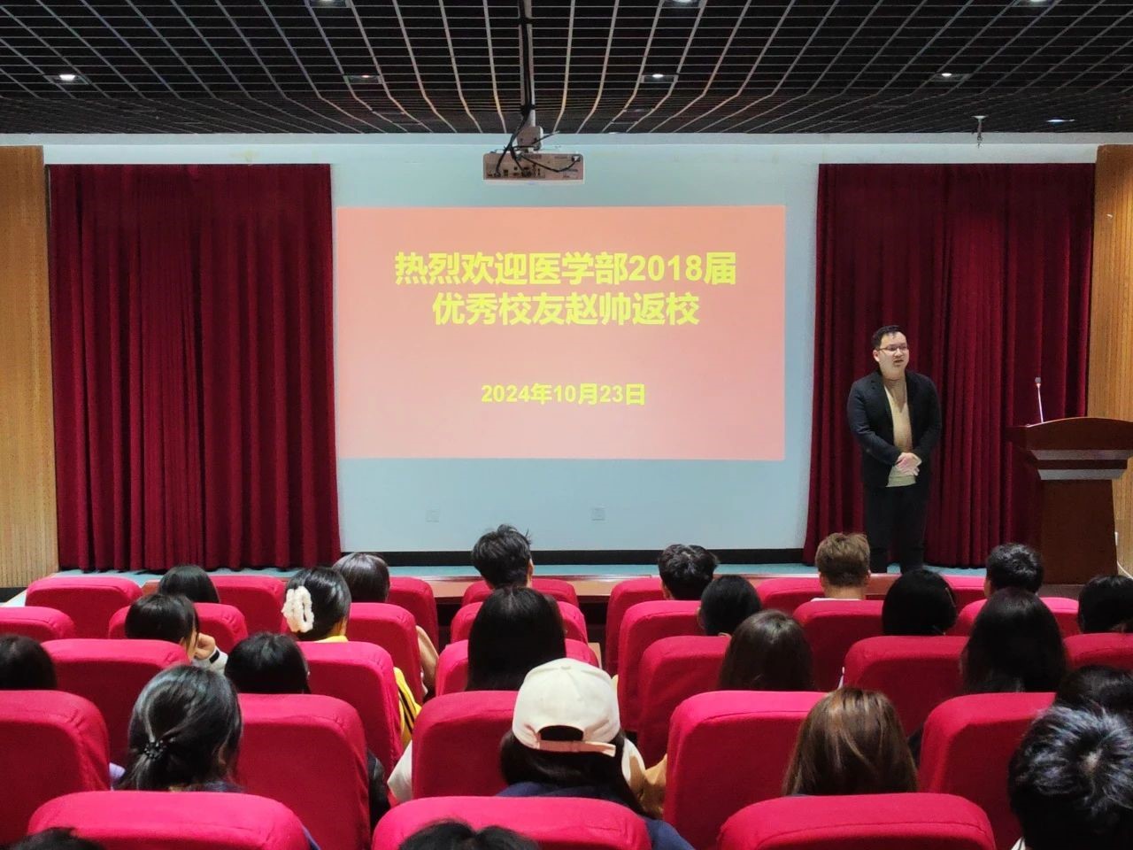 为搭建起校友与母校之间沟通的桥梁,激发学子的学习热情与职业梦想,10月23日,bat365官方网站邀请18届优秀校友赵帅于教学楼一楼学术报告厅进行分享交流。医学技术科教中心学生参加,党政学工办公室副主任田恒运主持。