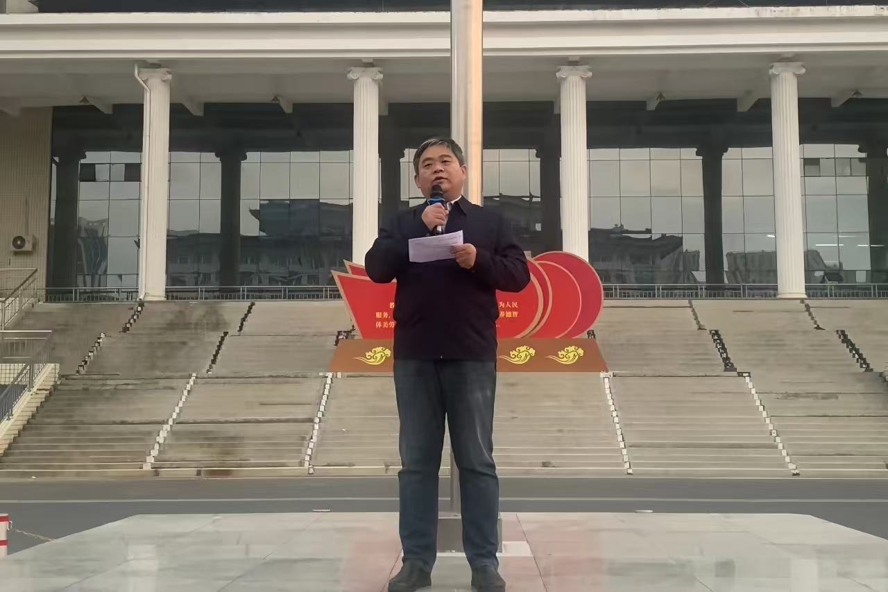 张伟作国旗下讲话。他指出,全体师生要坚持以“党的二十届三中全会精神”和“全国教育大会精神”为指引,在强国建设、民族复兴的新征程上,争做开拓者、奋进者和实战家。接着,他回顾了胡大白董事长创办学校的艰苦历程,总结了学部成立以来在教育教学改革、学科竞赛、科学研究等方面取得的优异成绩,在建校四十周年之际,勉励全体师生发扬开拓拼搏、实干奉献的黄科大精神,传承“敢为天下先”的创业基因。最后,他对学部下阶段工作提出四个要求,一是要深入学习贯彻党的二十届三中全会精神和全国教育大会精神;二是要持续营造良好的学风,发扬学部优良传统;三是要持续守好安全底线,开展好安全隐患排查工作;四是要以校庆杯各类比赛为契机,加强日常体育锻炼,促进身心健康。