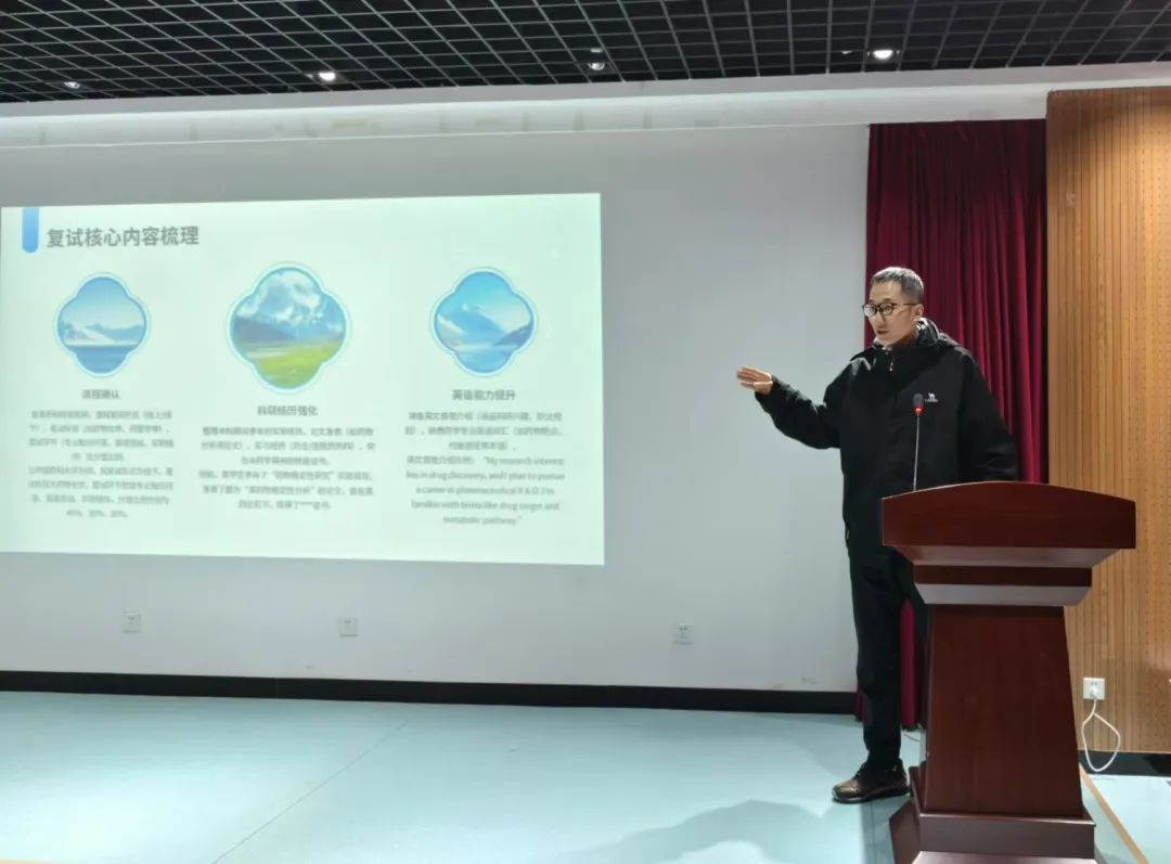 讲座中,李乐围绕药学考研复试与调剂的要点进行了深入浅出的讲解。他首先强调了复试准备的重要性,包括确认复试流程、强化科研经历、提升英语能力等方面。李乐指出,学生们应先登录目标院校官网,详细了解复试形式、笔试科目以及面试环节等具体信息,并结合自身情况制定针对性的复习计划。