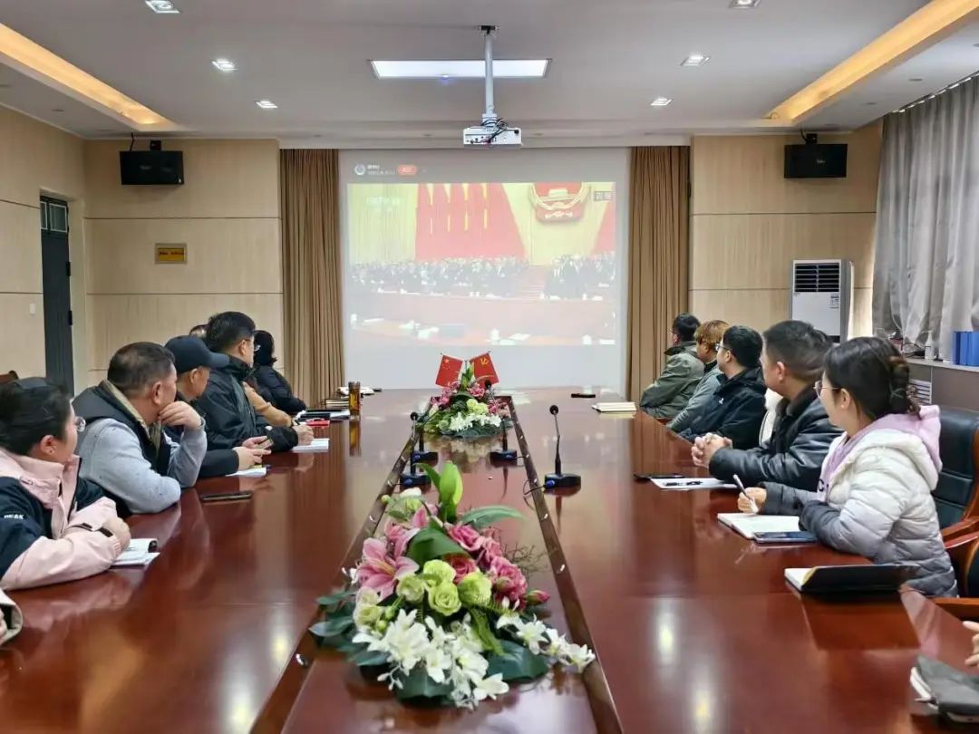 在四楼会议室,学院领导班子成员、教职员工代表聚精会神聆听报告。教学楼报告厅内,学生党员、团学骨干通过大屏幕实时观看直播。