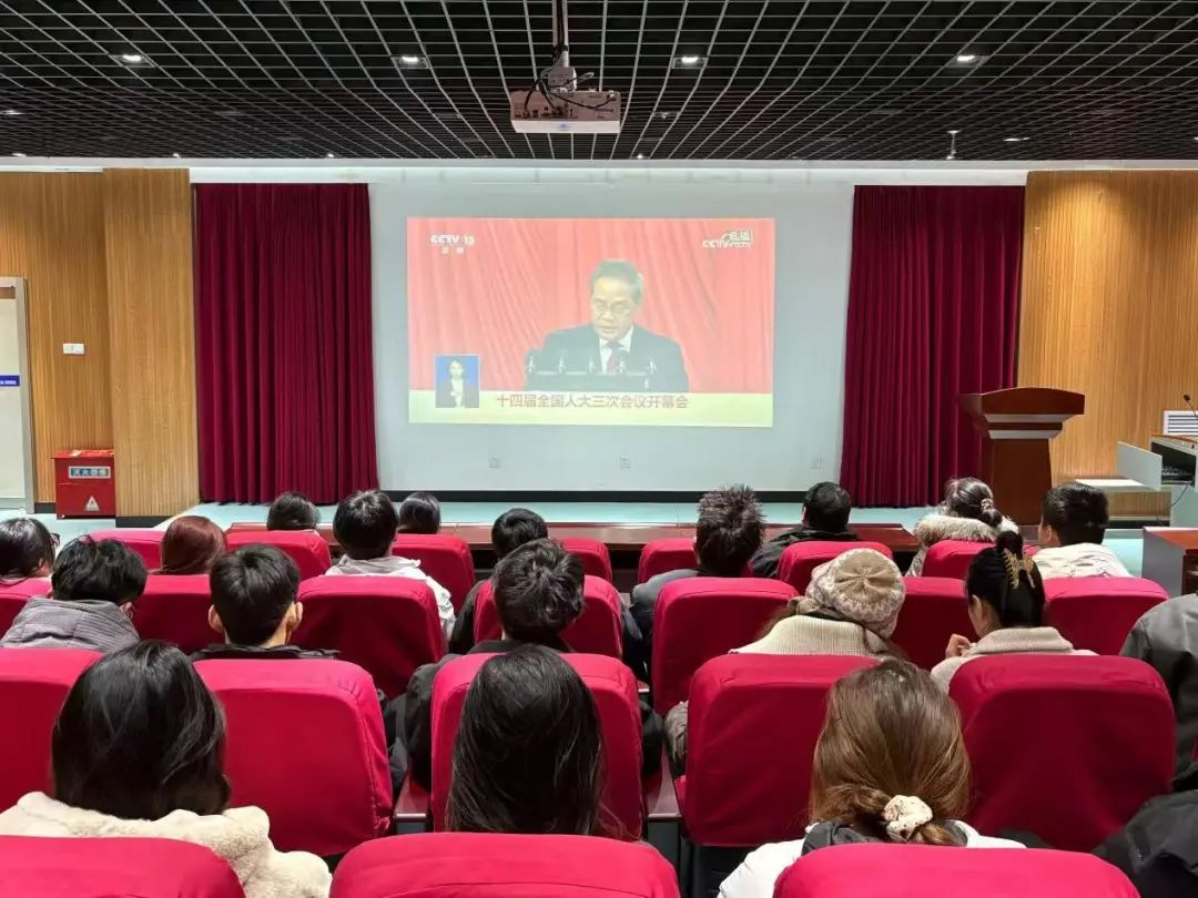 2025年3月5日上午9时,第十四届全国人民代表大会第三次会议在北京人民大会堂隆重开幕。bat365官方网站分党委组织师生代表分两个会场(教学楼四楼会议室和一楼报告厅)同步观看开幕会直播,共计200余名师生集中观看了国务院总理李强作的政府工作报告。