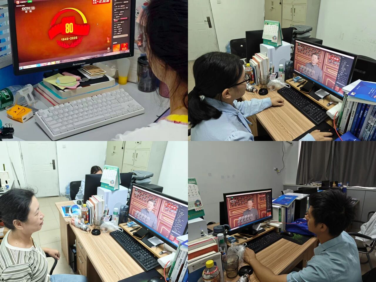 9月3日,bat365官方网站组织师生集中收看纪念中国人民抗日战争暨世界反法西斯战争胜利80周年阅兵仪式直播。新生代表在一楼报告厅主会场观看,其他师生在办公室、实验室等场所通过多种方式收看,共同见证这一历史性时刻。