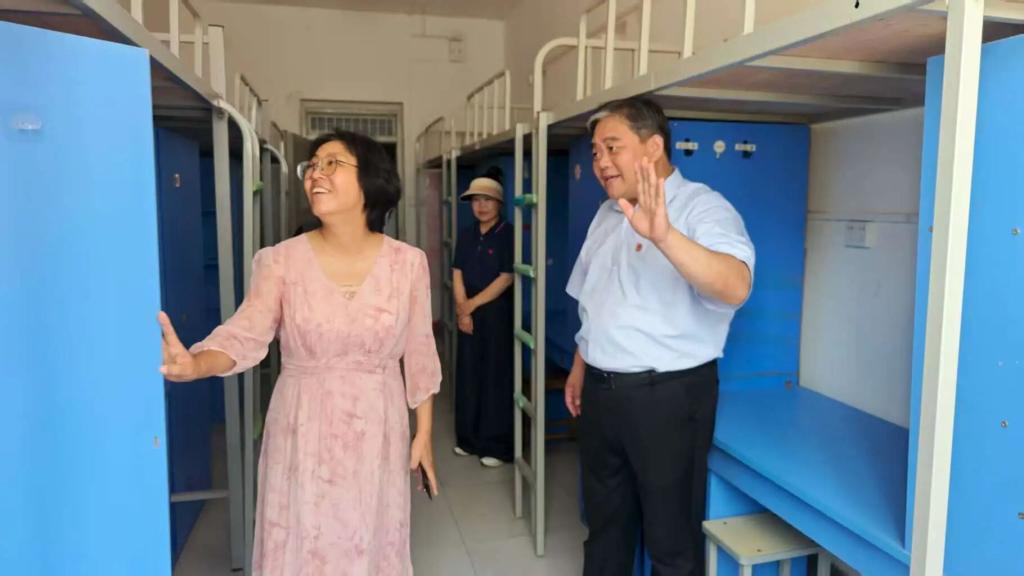 随后,赵会利一行走进学生宿舍,细致检查消毒通风与床位安排情况,认真听取新生对居住环境的反馈,叮嘱务必为每一位学生提供安全、温馨的生活条件。检查过程中,赵会利还在学生公寓宿舍接待处与新生亲切交谈,应新生邀请合影留念,温馨画面洋溢浓浓师生情。