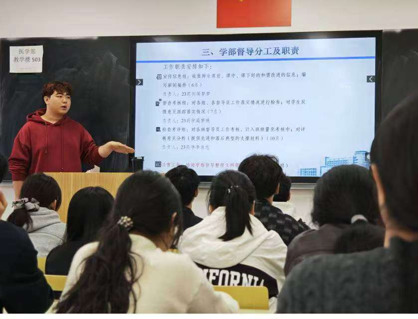 学生督导干部李浩志就督导工作职责与考核要求作具体部署,详细介绍了宣传信息组、督查考核组、检查考评组三个职能小组的工作内容,明确了日常值班、课堂巡查、材料归档等环节的操作规范。同时,传达了督导考核与激励办法,进一步调动学生督导干部的工作积极性与责任意识。