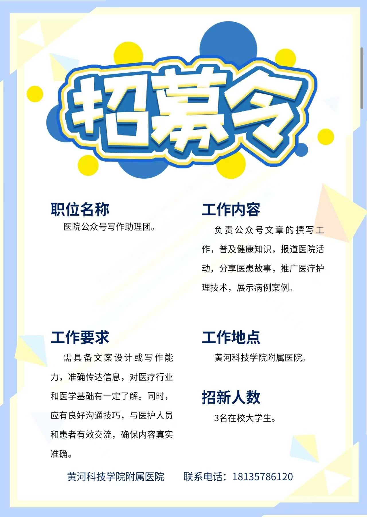 负责公众号文章的撰写工作,普及健康知识,报道医院活动,分享医患故事,推广医疗护理技术,展示病例案例。