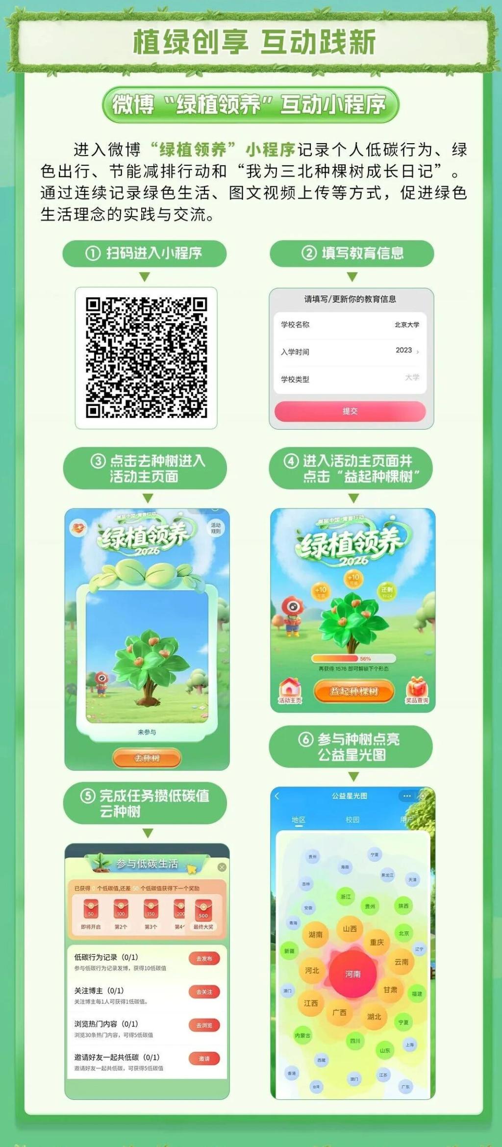 为深入学习宣传贯彻习近平生态文明思想,贯彻落实“十五五”时期“加快经济社会发展全面绿色转型,建设美丽中国”的部署,深化实施“美丽中国·青春行动”,微博校园联合团省委、省青年志愿者协会共同发起2026全省青少年绿色生活实践活动-绿植领养活动,利用组织动员优势,凝聚网络动员合力,聚焦“1+2+4+N”目标任务体系,进一步引领广大青少年投身美丽河南建设,共同营造和谐共生的生态环境。