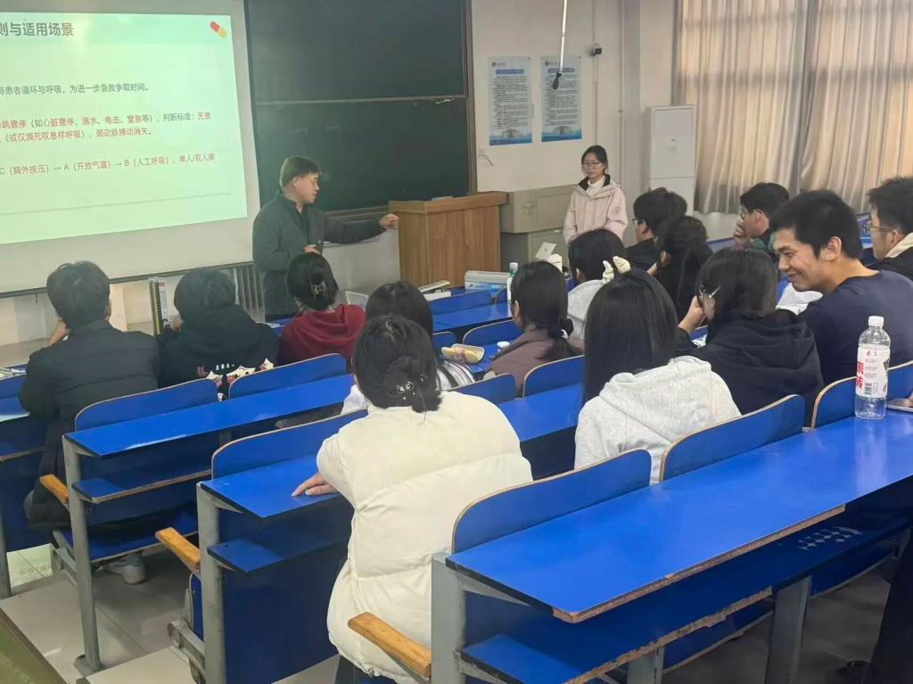 在理论讲解与演示环节,翟雪茹结合临床知识,系统讲解了血压测量的完整流程,并重点指出了常见操作误区。她详细讲授CPR急救技能,进行了细致分解与精准示范,确保同学们掌握核心要领。马社敏结合真实临床案例强调了操作的规范性与实用性,帮助同学们深化理解,构建清晰的操作逻辑。